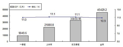 (一)国民经济保持平稳较快增长。初步核算,全年实现生产总值45429.2亿元,增长10.9%。粮食生产克服冬春连旱的不利影响,实现连续九年增产,总产885亿斤,比上年增长2.1%。认真贯彻中央和全省水利工作会议精神,水利建设取得明显成效,完成水利工程投资175亿元,新增改善灌溉面积1200万亩。深入实施工业调整振兴规划,工业生产保持平稳增长,规模以上工业增加值增长14%,39个行业大类中有38个实现增长。全面落实促进服务业发展的政策,编制实施了十大领域专项规划,启动了省级服务业综合改革试点,安排省级服务业发展引导资金1.9亿元,支持了101个重点项目建设,全省服务业增加值达17418亿元,增长11.3%。