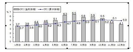 (二)宏观调控政策得到全面落实。全省着力抓好重要商品的产运销衔接和市场供应,物价涨势得到有效遏制,全年居民消费价格上涨5%,低于全国0.4个百分点。17个市全部建立了社会救助和保障标准与物价上涨挂钩联动机制,11个市启动了联动机制,累计发放临时价格补贴7.2亿元。落实国家房地产调控政策效果明显,12月份,全省新建商品住宅销售价格同比上涨1.4%,涨幅比6月份回落4.5个百分点。金融运行比较稳定,全省金融机构本外币贷款比年初增加5029亿元。安排省级创业投资引导基金3亿元,设立合作创投机构14家。发行企业债券20支,募集资金190.8亿元。