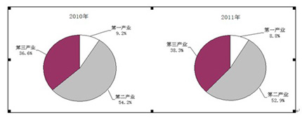 (三)转方式调结构取得明显成效。产业结构进一步优化,三次产业比例由2010年的9.2︰54.2︰36.6调整为8.8︰52.9︰38.3,服务业增加值所占比重提高1.7个百分点。深入推进“双轮驱动”战略,传统产业改造升级步伐加快,装备制造业增加值增长16.2%,比规模以上工业增幅高2.2个百分点。战略性新兴产业快速发展,新口径高新技术产业产值占规模以上工业产值的比重达27.3%,比年初提高1.2个百分点。自主创新得到加强,研发投入占生产总值的比重达到1.8%;全省专利申请109599件,专利授权58843件,分别增长35.6%和14.3%。节能减排力度加大,关停小火电机组62.7万千瓦,淘汰落后炼钢产能80万吨、炼铁812.6万吨、水泥1414.8万吨,万元生产总值能耗和主要污染物排放量继续下降。