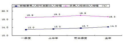 图4 2011年全省城镇居民人均可支配收入、农民人均纯收入增幅 (注:一至三季度为农民人均现金收入)