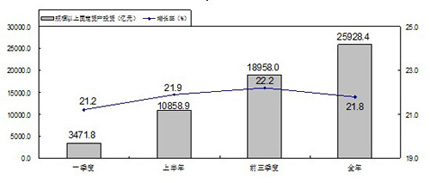 (四)经济运行质量效益继续改善。财政收入保持较高增幅,全年完成地方财政收入3455.7亿元,增长25.7%,其中税收收入2602.4亿元,增长21.1%。规模以上工业企业实现主营业务收入102470.2亿元,增长26.4%;实现利润6998.3亿元,增长27.2%;利税11136.2亿元,增长25.3%。城乡居民收入增长较快,城镇居民人均可支配收入达到22792元、农民人均纯收入8342元,分别增长14.3%和19.3%,均高于全省生产总值增幅。