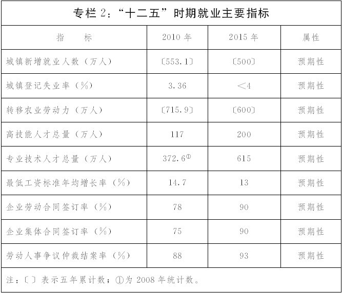 1.持续扩大就业规模,进一步优化就业结构。城镇新增就业500万人,转移农业劳动力600万人,应届高校毕业生总体就业率稳定在80%以上。城镇就业比重逐步提高,三次产业就业结构更加优化。