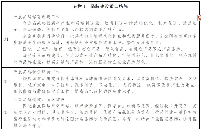 (四)创建品牌培育激励机制。大力实施名牌发展战略,发挥品牌引领带动作用。制定并实施培育品牌发展的制度措施,开展知名品牌培育创建工作。按照国家品牌建设标准体系和品牌价值评价制度要求,建立我省品牌价值标准化技术委员会,积极开展品牌价值评价工作。加大自主知识产权产品的保护力度,建设有利于品牌发展的长效机制和良好环境。支持企业依托技术标准开拓海外市场,实施品牌经营和市场多元化战略,积极办理商标国际注册,打造世界知名品牌。继续组织好驰名商标的申请认定和保护,加强地理标志产品争创和地理标志商标的申请注册、规范使用和管理保护,进一步做好山东名牌产品、山东省著名商标等培育工作,树立“鲁商、鲁企、鲁货”和“好客山东”的品牌形象。