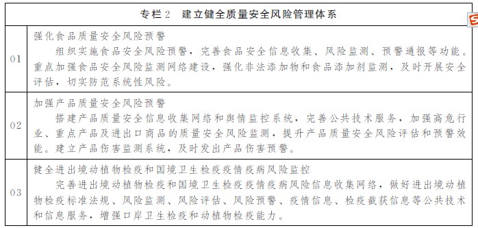 (四)实施质量安全风险管理。建立重点产品、重点行业和重点地区的质量安全风险监测和分析评估制度,实行重大质量事故报告和产品伤害监测制度,对区域性、行业性、系统性质量风险及时发布预警。完善产品伤害监测系统,搭建产品质量安全信息收集网络,建立产品质量安全信息舆情监控系统及产品质量安全风险预警公共技术服务平台。进一步完善有害生物防御体系、进出口农产品和食品质量安全保障体系、进出口工业品质量安全监控体系和国境卫生检疫风险监控体系,保障进出口农产品、食品和工业品质量安全。完善质量安全风险管理工作机制,制定质量安全风险应急预案,加强风险信息资源共享,提升质量安全风险评估预警水平和防范处置能力,切实做到对质量安全风险的早发现、早研判、早预警、早处置。