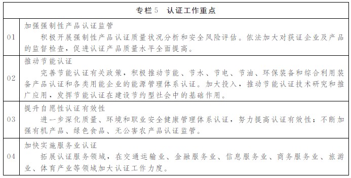 (四)完善认证监管体系。建立法律规范、行业自律、社会监督相结合的认证监管体系。围绕全省重点和高新技术产业或区域,进一步加大认证推广力度,鼓励更多企业根据自身实际和发展需要,开展自愿性认证活动,积极推进产品质量、食品安全、环境保护、职业健康安全、社会责任管理体系认证;开展节能认证示范区建设,推动制造业特别是新能源产业有序开展产品质量和重点用能企业能源管理体系认证。完善节能认证鼓励政策,加强对低碳产品、碳足迹、碳标识、节能量等认证工作的研究和跟进。加大对认证机构、认证产品生产企业执法监管力度,切实提高认证有效性,促进企业质量管理水平和产品质量档次提升。