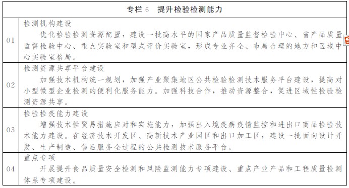 (五)加快检验检测技术能力建设。围绕我省重点区域带动战略发展需求,加强技术机构统一规划,推进技术机构资源整合、优化检验检测资源配置,实现合理布局。各级政府要加大对公共检测平台的财政投入和支持力度,建立与全省产业总体布局相一致、与重点发展新兴产业相吻合、与产业集群发展需求相适应的公共技术服务平台,重点提升新能源、新材料、新信息、新医药和海洋开发等战略性新兴产业以及食品和重点工业产品领域的质量评估、风险监测、科研攻关、标准制定能力建设。推动组建检验检测技术联盟,实现区域性检验检测资源共享。综合运用财税、金融、土地等优惠政策,支持检验检测技术保障能力建设,完善配套服务功能,推进资源整合,实行差异化发展。加强对技术机构的分类指导和监管,规范检验检测行为,提高检验检测质量和服务水平。