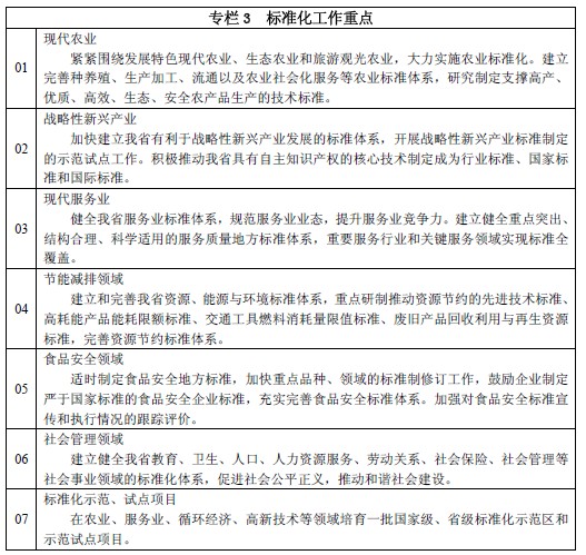 (二)提升标准化工作水平。加快现代农业、先进制造业、战略性新兴产业、现代服务业、节能减排、食品安全、社会管理和公共服务等领域标准体系建设。建立完善种养殖、生产加工和流通领域农业标准体系。抓好金融保险、现代物流、科技信息、商务服务、交通运输等生产性服务业和批发零售、住宿餐饮、文化旅游、房地产业、家庭服务等生活性服务业标准制(修)订工作。组织好战略性新兴产业领域的标准制定,完善产业发展急需的标准体系。积极推动我省具有自主知识产权的核心技术成为行业标准、国家标准和国际标准。大力开展联盟标准的制订和推广工作,培育和发展一批具有较强竞争实力的产业集群,推动产业结构优化升级。