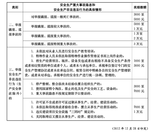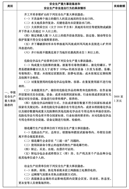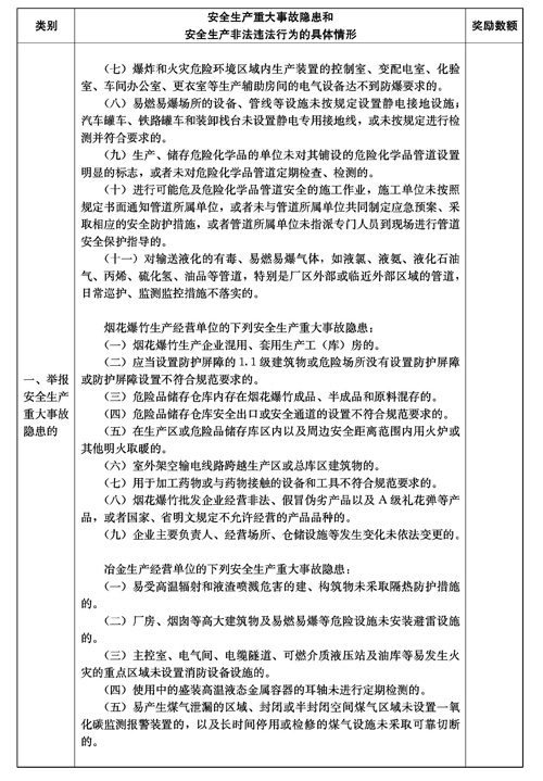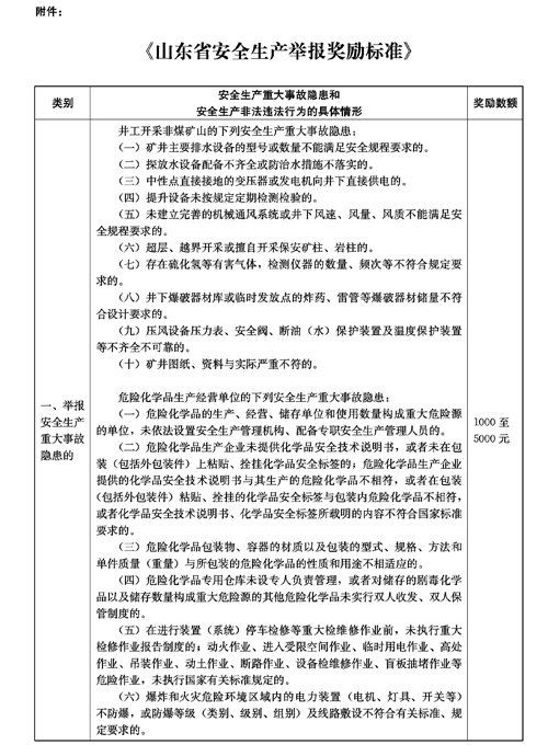 安全生产重大事故隐患和安全生产非法违法行为的具体情形和奖励数额,见附件《山东省安全生产举报奖励标准》。
