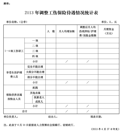 调整一级至四级工伤职工伤残津贴、生活护理费和工亡职工供养亲属抚恤金标准,充分体现了党和政府对工伤职工以及工亡职工亲属的关怀。各市人力资源社会保障局、财政局及各有关单位一定要高度重视,切实加强领导,精心组织实施,确保2013年5月底前完成此项工作,将待遇发放到相关人员手中。6月10日前,各市要搞好总结,连同《2013年调整工伤保险待遇情况统计表》(见附件),分别报省人力资源社会保障厅、省财政厅。