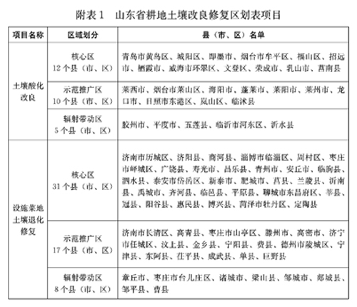 (一)土壤改良修复工程。以治理土壤酸化和次生盐渍化为重点,加快推广应用功能性有机肥、水肥一体化配套设备、矿物源土壤调理剂,大力推广果园生草技术。在土壤酸化程度比较严重的胶东地区,施用土壤调理剂,中和酸性土壤,改善土壤理化性状;在果园中种植绿肥植物,增加土壤有机质含量,调理土壤酸碱度。在设施蔬菜栽培集中区域,重点推广水肥一体化技术,通过配套建设微滴灌设施,将施肥和灌溉同步进行、一体化管理;进一步加大微生物和有机肥推广力度,有效减少化肥施用量。