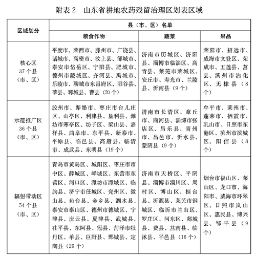 耕地农药残留治理项目:在粮食、蔬菜、果品生产大县(市、区)推广应用农药残留降解和农药减量控害技术。粮食作物实施总面积1700万亩,其中项目核心区20个县(市、区)800万亩,示范推广区19个县(市、区)500万亩,辐射带动区29个县(市、区)400万亩;蔬菜实施总面积900万亩,其中项目核心区9个县(市、区)400万亩,示范推广区9个县(市、区)300万亩,辐射带动区16个县(市、区)200万亩;果树实施总面积300万亩,其中项目核心区8个县(市、区)150万亩,示范推广区8个县(市、区)100万亩,辐射带动区9个县(市、区)50万亩。施用微生物降解菌剂,推广应用物理防治、生物防治技术和高效低毒环境友好型农药,配套推广相应的高效施药器械和农药增效助剂(附表2)。