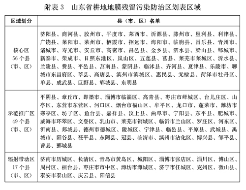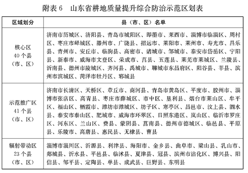 考虑土壤地力退化、农药残留污染、地膜残留污染、秸秆未有效利用、畜禽粪便污染、重金属污染6大问题的污染程度和在同一区域的重叠次数,本着统筹规划、突出重点的原则,将全省耕地划分为3类综合防治区,其中核心区40个县(市、区),示范推广区41个县(市、区),辐射带动区23个县(市、区)(附表6)。此区划为综合防治示范项目优先安排依据,不另外安排项目计划投资。