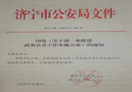 二是压实公开责任,强力推进政务公开工作科学发展。2018年来,为了更好地应对新时期党委政府和人民群众对公安机关政务公开工作的新要求、新期待,济宁市公安局进一步加大工作推动力度,于8月份以局文方式出台了《关于进一步推进政务公开工作实施方案》,下发各单位贯彻执行,切实将相关局属单位纳入市公安局政务公开工作的大盘子,从思想认识、工作原则、工作措施、组织体系等33个条款方面对工作进行了全面的明确和部署。8月17日,市公安局召开政务公开工作推进会,局属各单位分管领导和联络员参加会议,传达学习了实施方案,并对相关工作提出了严肃要求。在此基础上,牵头部门市公安局指挥中心组织各单位工作人员到指挥中心进行跟班学习,全面提升政务公开工作人员的业务能力和水平,使公安机关政务公开工作走上了快车道。