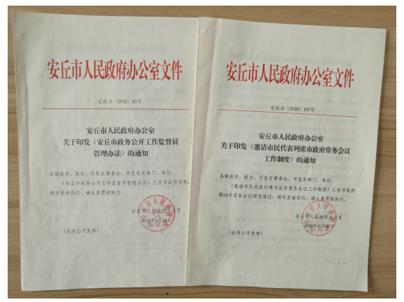 为不断提高政府决策水平,增强政府工作透明度,依法保障群众的知情权、表达权和参与权,安丘市先后制定出台了政务公开工作监督员制度、市民代表列席市政府常务会议工作制度。自建立政务公开工作监督员队伍以来,共组织召开监督员工作例会2次,开展集中监督活动3次,列席政府常务会议议题22个,提出政务公开存在的问题14个、意见建议6个,为全市推进政务公开工作发挥了积极作用。