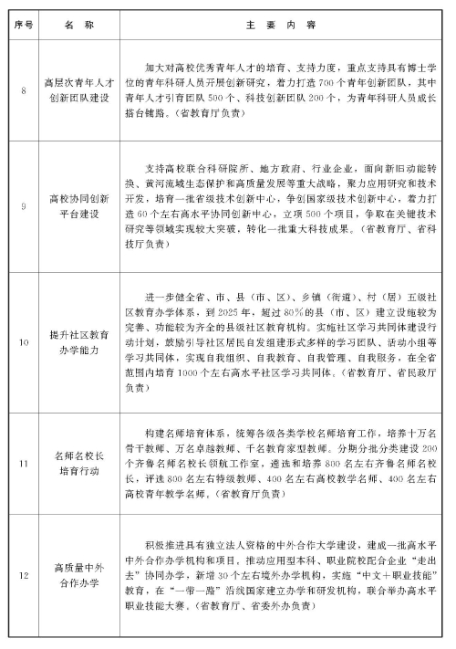 服务国家战略和山东经济社会发展能力显著提升。建成全国职业教育创新发展新模式、高等教育改革发展新样态,有效支撑山东半岛城市群在黄河流域生态保护和高质量发展中发挥龙头作用。省市一体化推进济南新旧动能转换起步区教育改革发展。“一带一路”教育合作全面推进,打造形成教育对外开放的桥头堡。建成一批高层次科技创新平台,形成一批具有重大影响力的创新成果,建立较为完善的科技成果转移转化机制。人才培养规模和质量契合“十强”现代优势产业集群发展需要。