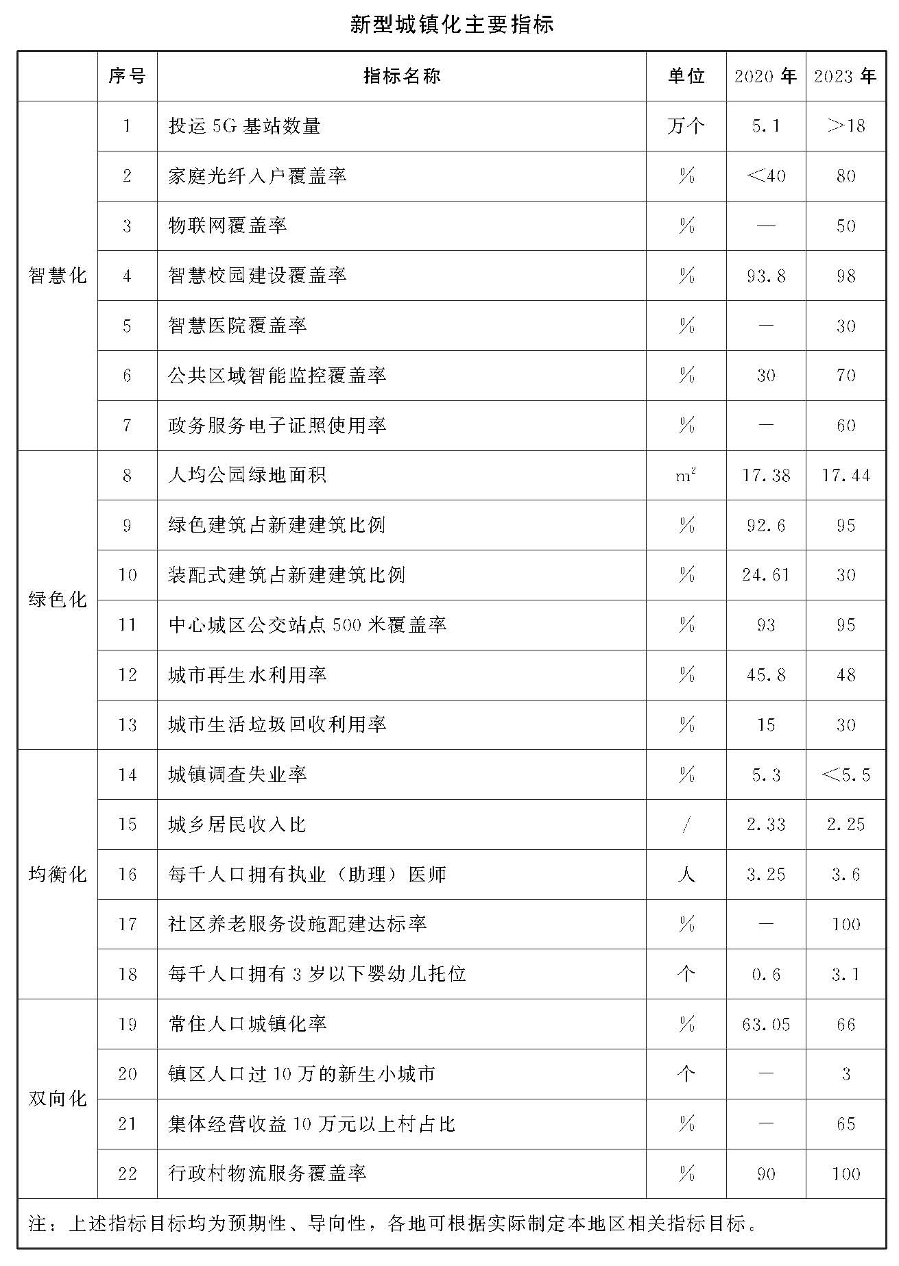 序号指标名称单位2020年2023年智慧化1投运5G基站数量万个5.1>182家庭光纤入户覆盖率%<40803物联网覆盖率%—504智慧校园建设覆盖率%93.8985智慧医院覆盖率%-306公共区域智能监控覆盖率%30707政务服务电子证照使用率%-60绿色化8人均公园绿地面积m217.3817.449绿色建筑占新建建筑比例%92.69510装配式建筑占新建建筑比例%24.613011中心城区公交站点500米覆盖率%939512城市再生水利用率%45.84813城市生活垃圾回收利用率%1530均衡化14城镇调查失业率%5.3<5.515城乡居民收入比/2.332.2516每千人口拥有执业(助理)医师人3.253.617社区养老服务设施配建达标率%-10018每千人口拥有3岁以下婴幼儿托位个0.63.1双向化19常住人口城镇化率%63.056620镇区人口过10万的新生小城市个-321集体经营收益10万元以上村占比%-6522行政村物流服务覆盖率%90100注:上述指标目标均为预期性、导向性,各地可根据实际制定本地区相关指标目标。