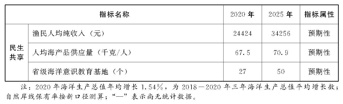 6.海洋发展民生福祉持续增进。海洋改善居民就业与提高生活品质的作用稳步提升,涉海就业总量持续增长,优质绿色安全的海产品供应更为丰富,高品质亲海亲民空间不断拓展,海洋防灾减灾能力显著提高,全民海洋意识明显增强。