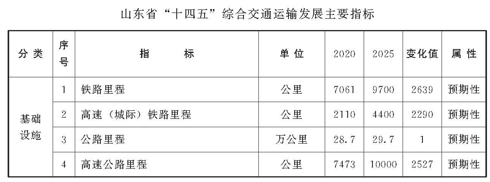 1.互联互通的基础设施主骨架基本建成。“一轴两廊十通道”的大通道基本形成。各种运输方式融合发展的综合交通大网络初步建成,基本实现“市市通高铁、县县双高速、户户硬化路”。“1+2+4+4+N”的大枢纽加快构建(“1”是建设山东半岛世界级港口群,“2”是打造和培育青岛、济南2个国际性综合交通枢纽城市,两个“4”分别是打造和培育烟台、潍坊、临沂、菏泽4个全国性综合交通枢纽城市和济南机场、青岛机场、烟台机场、临沂机场4个枢纽机场,“N”是加快建设一批综合交通枢纽设施),面向世界、连通全国、覆盖全省的枢纽集群基本形成,海洋港口迈向世界一流。