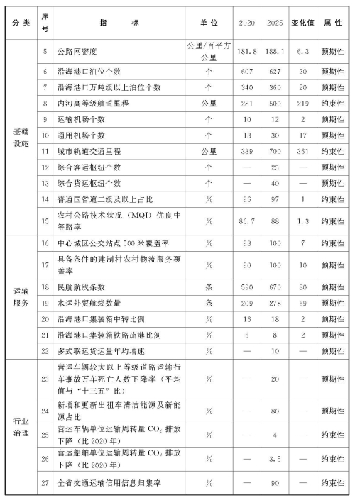 (1)高速公路。以实施“加密、扩容、提速、增智”四大工程为抓手,新建、改扩建高速公路近4000公里,进一步提升高速公路网连接效能和通达水平。到2025年,高速公路通车及在建里程达到10000公里,省际出口超过30个,双向六车道及以上占比达到36%,基本实现县(区、市)有两条以上高速通达。
