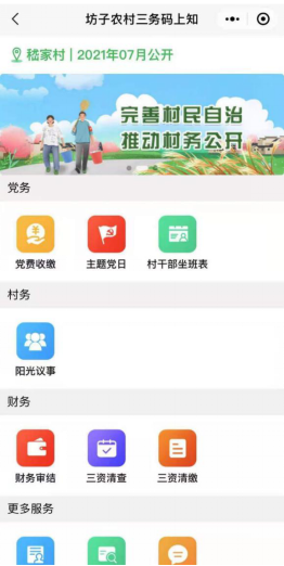 一是三务公开“码”上知。着力在公开的广度、深度和力度上下功夫,打破地域、时间和设备限制,推进村级党务、村务、财务全领域、全方位、全透明公开。“码上知”系统设置党务、村务、财务、更多服务4个模块共10项业务,村民通过手机登录即可查询党费收缴、阳光议事、财务审结等信息,真正实现“村民家中坐、信息‘码’上知”。
