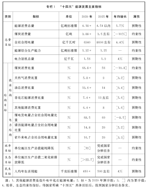2.结构目标。煤电发电量、清洁能源发电量、省外电量占全社会用电量的比重由68∶15∶17优化到60∶20∶20。煤炭消费比重下降到60%以内,非化石能源消费比重提高到13%左右。可再生能源电量占比提高到19%左右。
