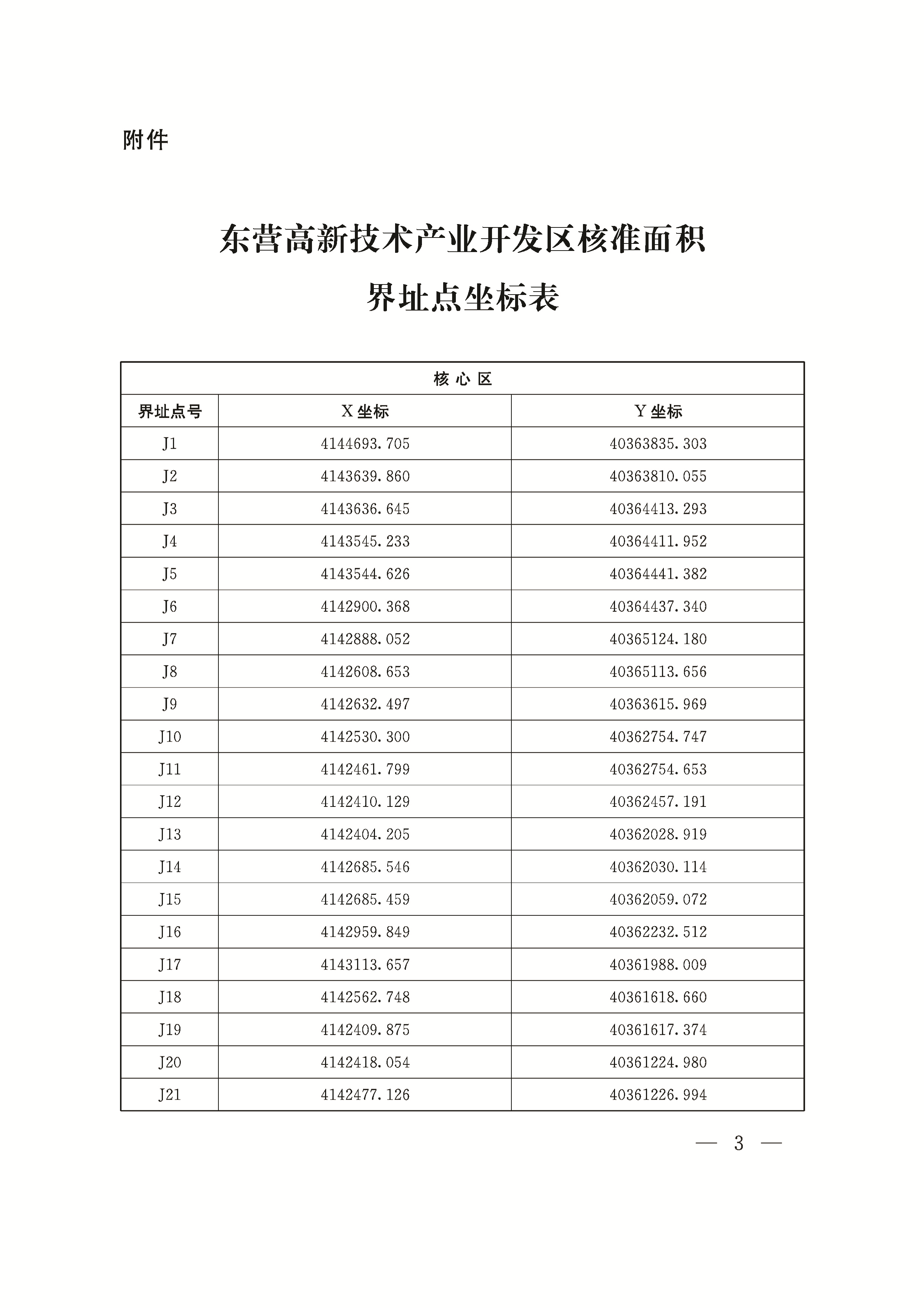 一、同意东营高新技术产业开发区核准面积调整。调整后的核准面积为1496.9002公顷,共三个区块,即“一区两园”。“一区”为东营高新区核心区,面积为1151.4287公顷,四至范围为东起西三路、燕山路,西至西六路,北起五干排、嘉祥路、邹城路,南至威海路、电厂铁路、南二路。"两园”为高端智能装备制造产业园(东营区油地融合产业园)、石油科技创新研发基地,其中,高端智能装备制造产业园面积261.6330公顷,四至范围为北起创新路,南至创汇路(城镇开发边界),东起规划经三路,西至规划西一号路(城镇开发边界);石油科技创新研发基地面积83.8385公顷,四至范围为西起胜利石油管理局、胜利广场、勘探开发研究院西侧支路,东至西二路,北起胜泰路、淄博路、设计院内部路、胜利油田中心医院内部路,南至北一路。具体以界址点坐标控制。