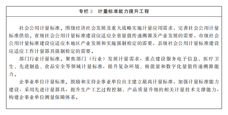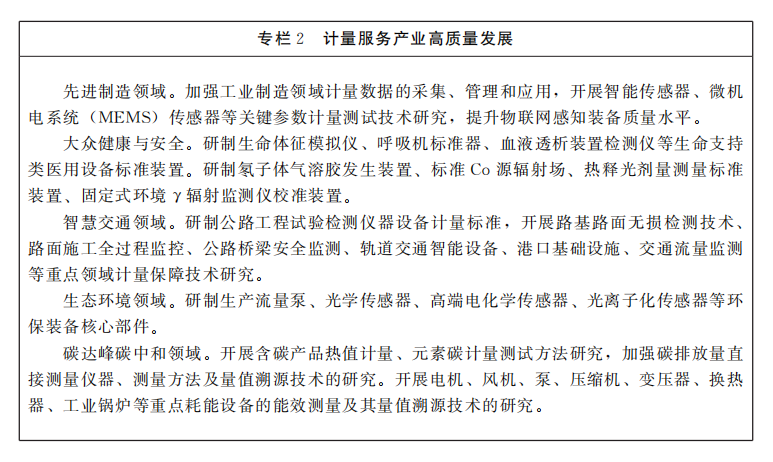 ——计量服务保障能力持续增强。新建产业计量测试中心10个以上,服务先进制造业企业3000家以上,引导发展100家左右具有较强竞争力的计量器具、传感器、仪器仪表生产企业,15家标准物质生产机构,培育20家具有核心竞争力的品牌企业。