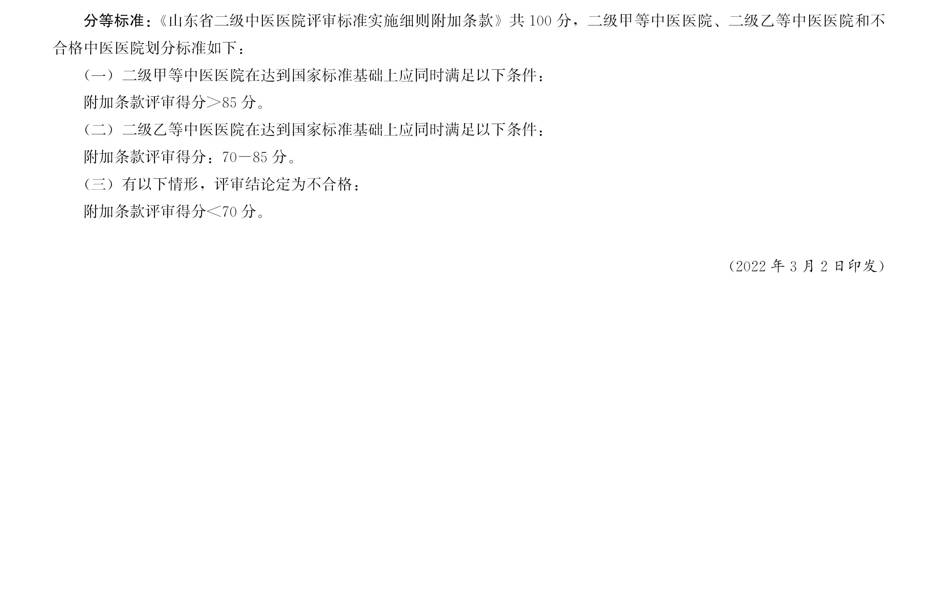 山东省卫生健康委员会关于印发《山东省三级中医医院评审标准实施细则附加条款及分等标准(暂行)》和《山东省二级中医医院评审标准实施细则附加条款及分等标准(暂行)》的通知