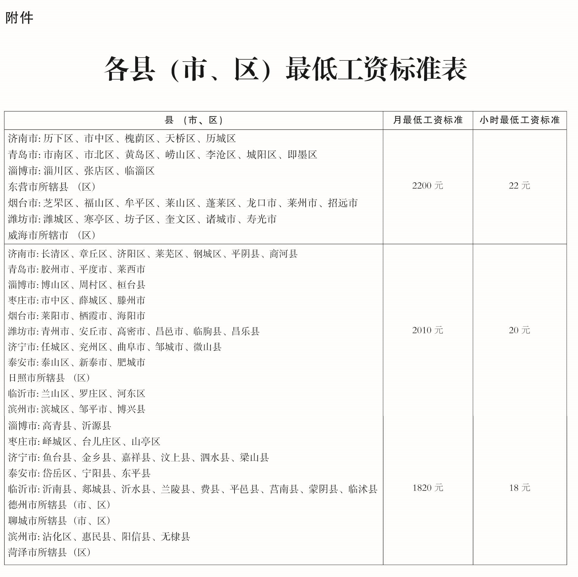 一、调整后的全省月最低工资标准为2200元、2010元、1820元;小时最低工资标准为22元、20元、18元。各县(市、区)最低工资标准见附件。