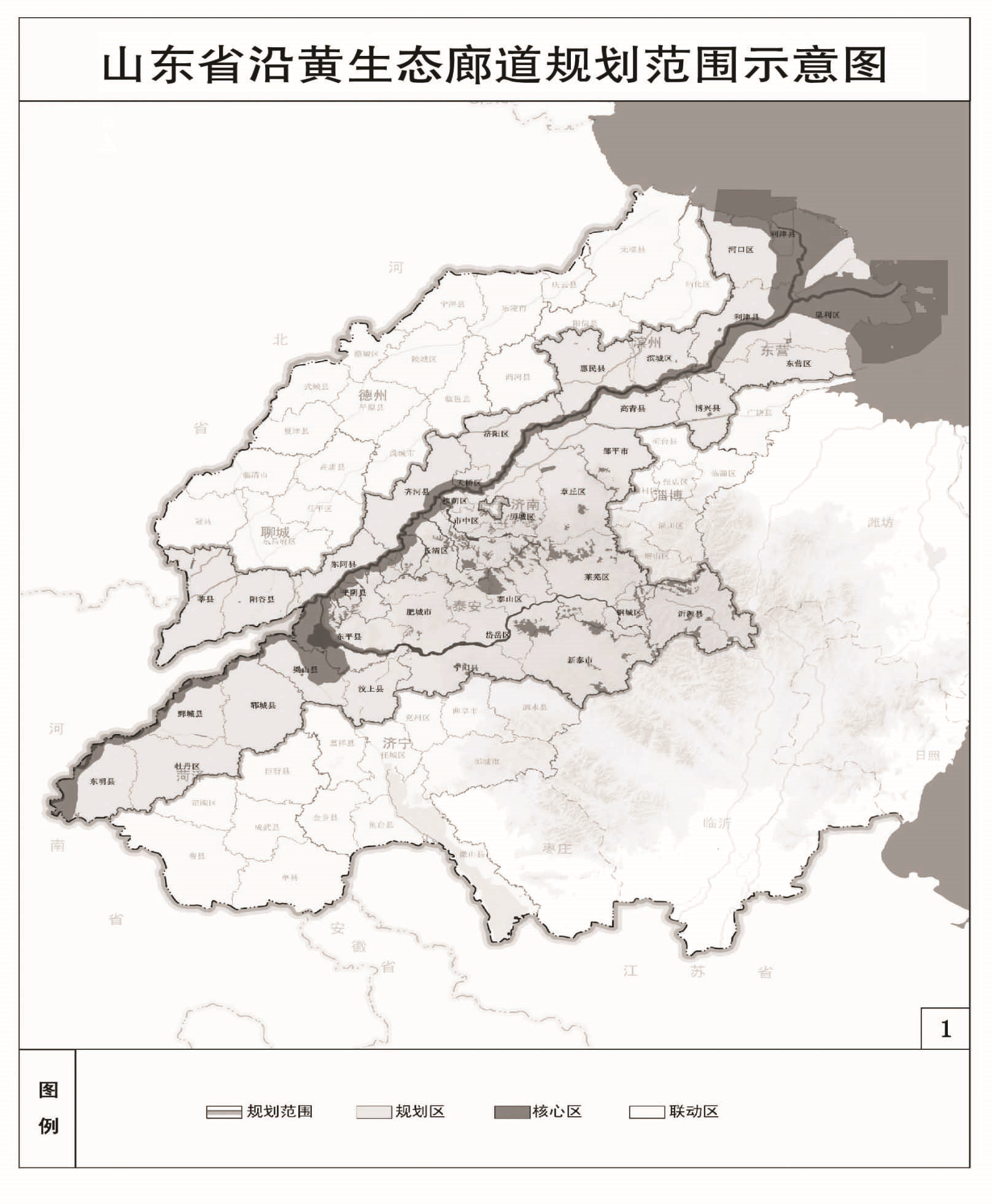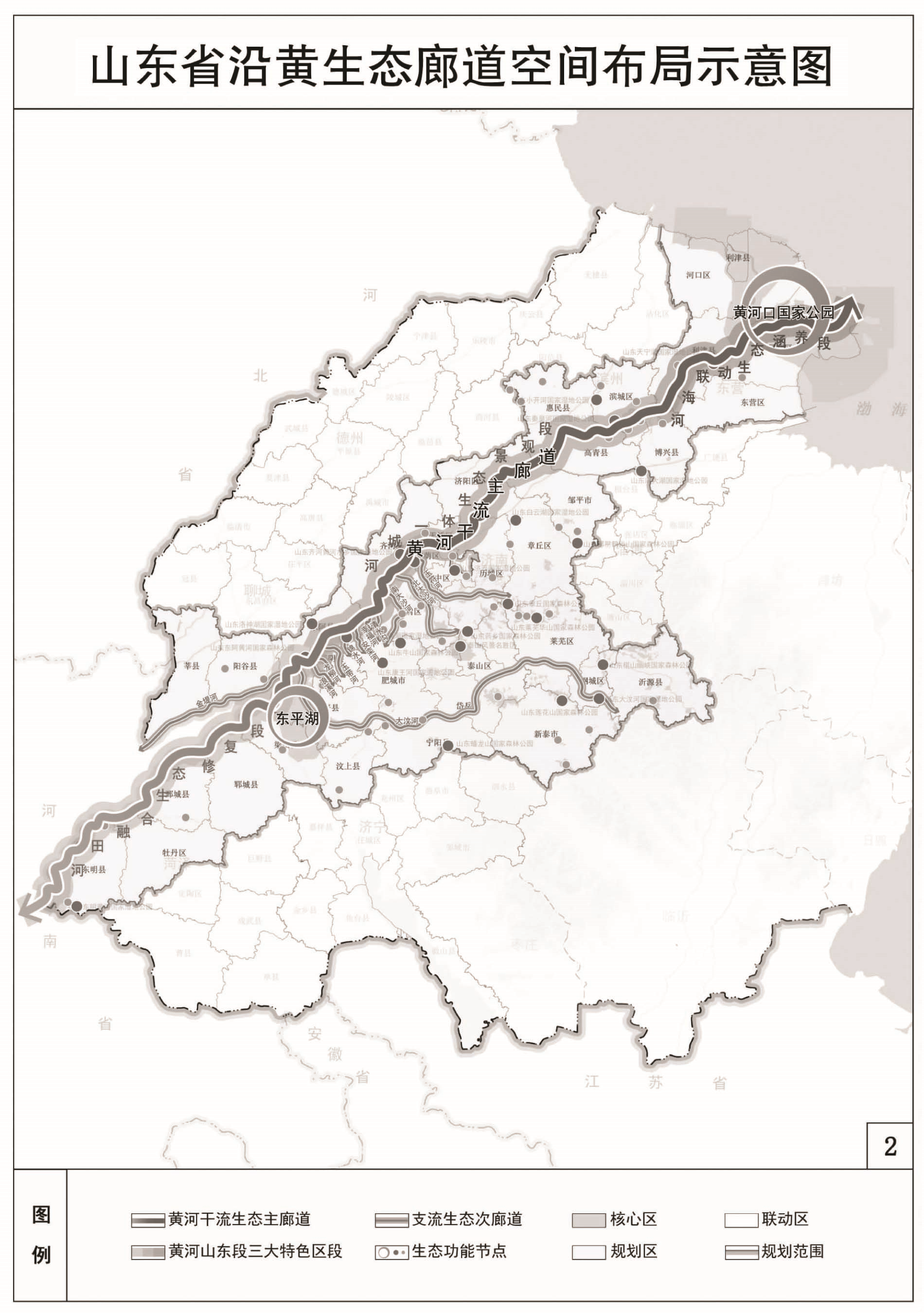 黄河山东段长628公里,占黄河总长度的11.5%,从东明县入境,流经菏泽、济宁、泰安、聊城、济南、德州、淄博、滨州、东营9市,在垦利区注入渤海。有金堤河、大汶河、浪溪河、龙柳河、玉带河、锦水河、安栾河、幸福河、清水沟、南大沙河、北大沙河、玉符河12条一级支流。规划范围为黄河干支流流经的县级行政区。核心区为黄河干流河道管理范围及向外延伸1000米覆盖的区域,12条一级支流河道管理范围,以及周边重要生态节点,面积约9825平方公里。联动区为沿黄9市其他县级行政区。规划期至2030年,分两个阶段推进实施,第一阶段为2023年至2025年,第二阶段为2026年至2030年。