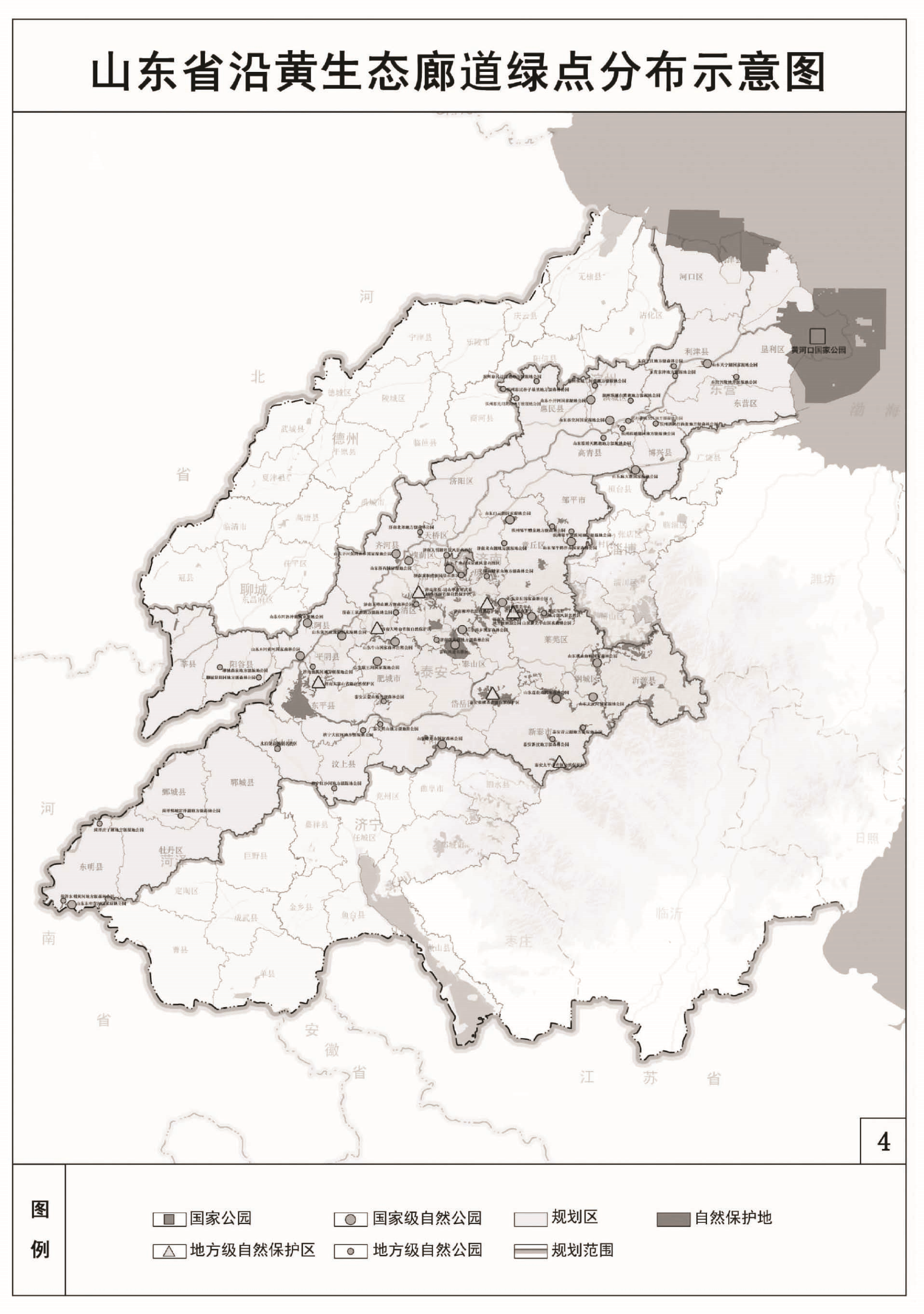 “多点”,即多处生态功能节点。依托自然保护区、自然公园、水利风景区等重要生态节点,合理定位自然保护地主体功能、边界范围,高标准建设黄河口国家公园,高水平提升东平湖生态功能,高质量建设济南大寨山、泰安徂徕山等自然保护区,高品质建设泰山风景名胜区等自然公园和菏泽黄河、济南百里黄河、垦利区黄河口等水利风景区,建立系统完善的自然保护地体系。