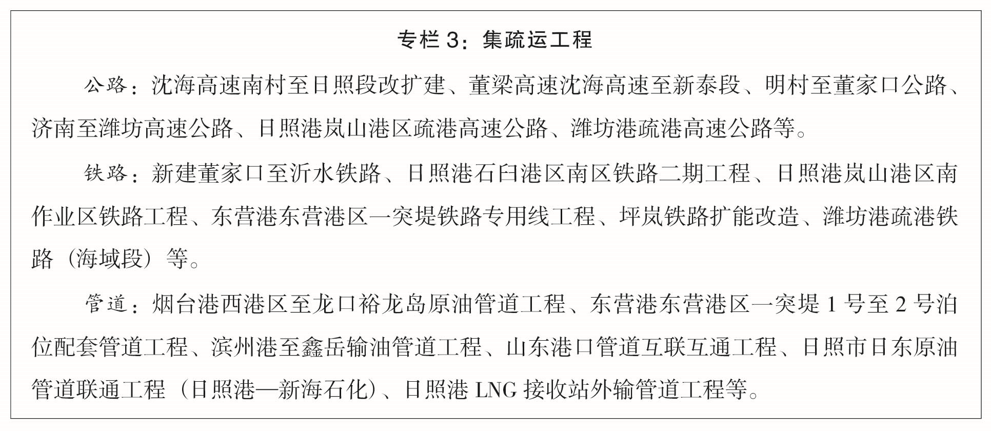 4. 完善综合集疏运体系。加强港口与腹地的交通衔接,重点实施18项工程,新建、改造一批港口集疏运高速公路、铁路、管道、传送廊道等设施,推进既有管线互联互通、集约利用。大力实施重要港区集疏运铁路“最后一公里”畅通工程,加快推动小清河与潍坊港、广利港、莱州港、龙口港海河联运。到2025年,新建改建港口集疏运高速公路620公里,重要港区铁路进港率超70%,输油管道总里程超过2400公里。(责任单位:省发展改革委、省交通运输厅、省能源局,沿海各市政府,中国铁路济南局集团有限公司、省港口集团、山东海洋集团)