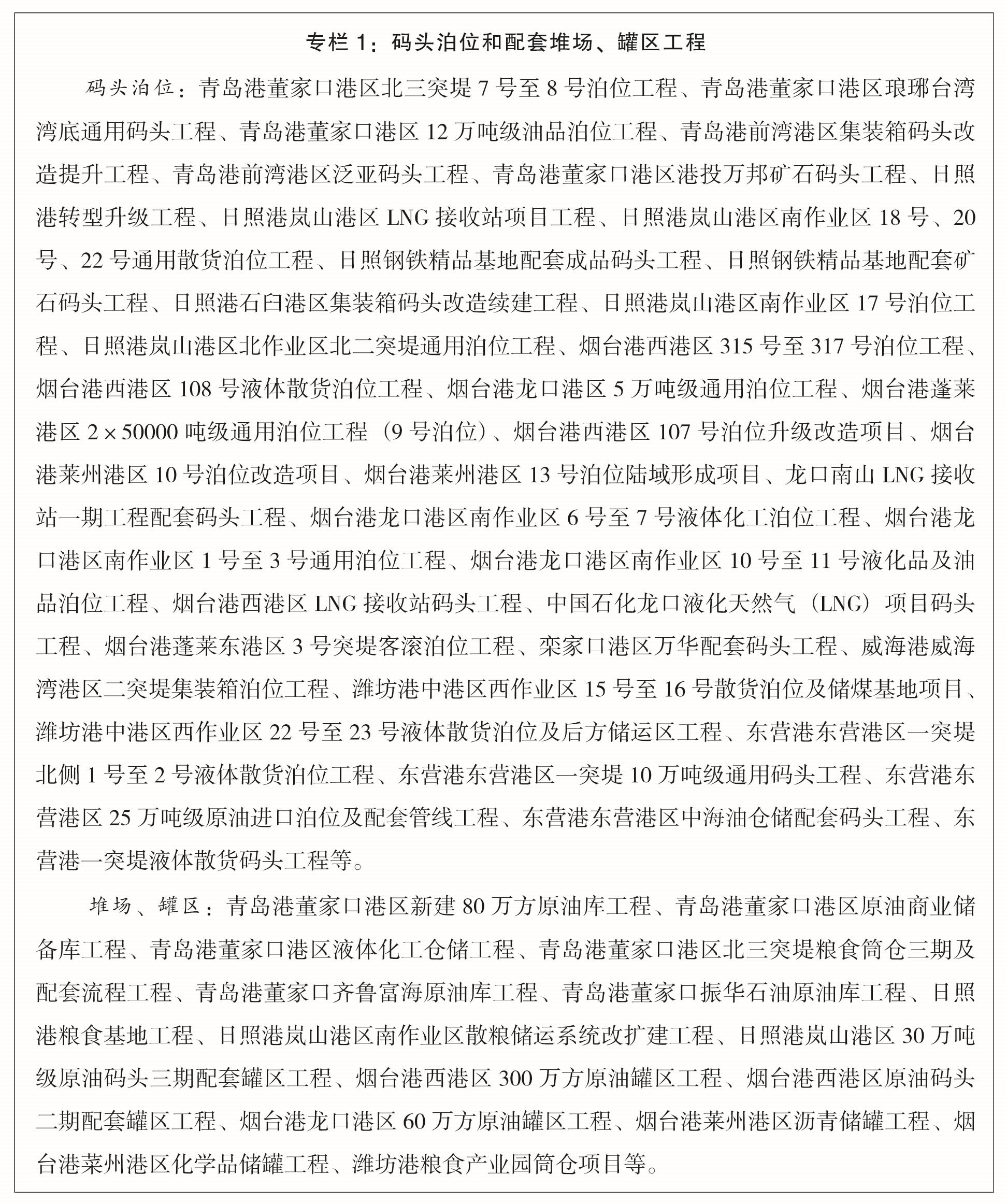 (二)强化规划支撑体系。加强港口规划与国土空间总体规划、产业发展规划统筹衔接,鼓励对港区周边空间布局实施战略留白,优先保障港口中长期发展空间。对标世界一流港口发展目标,编制实施《山东省世界级港口群建设中长期规划(2023—2035年)》,统筹各方优势资源,建设更高水平的世界级港口群,为全面建设社会主义现代化强国贡献山东港口力量。支持港口重大项目、重大工程列入全省重大产业规划和重点项目库。(责任单位:省交通运输厅、省发展改革委、省自然资源厅,沿海各市政府)