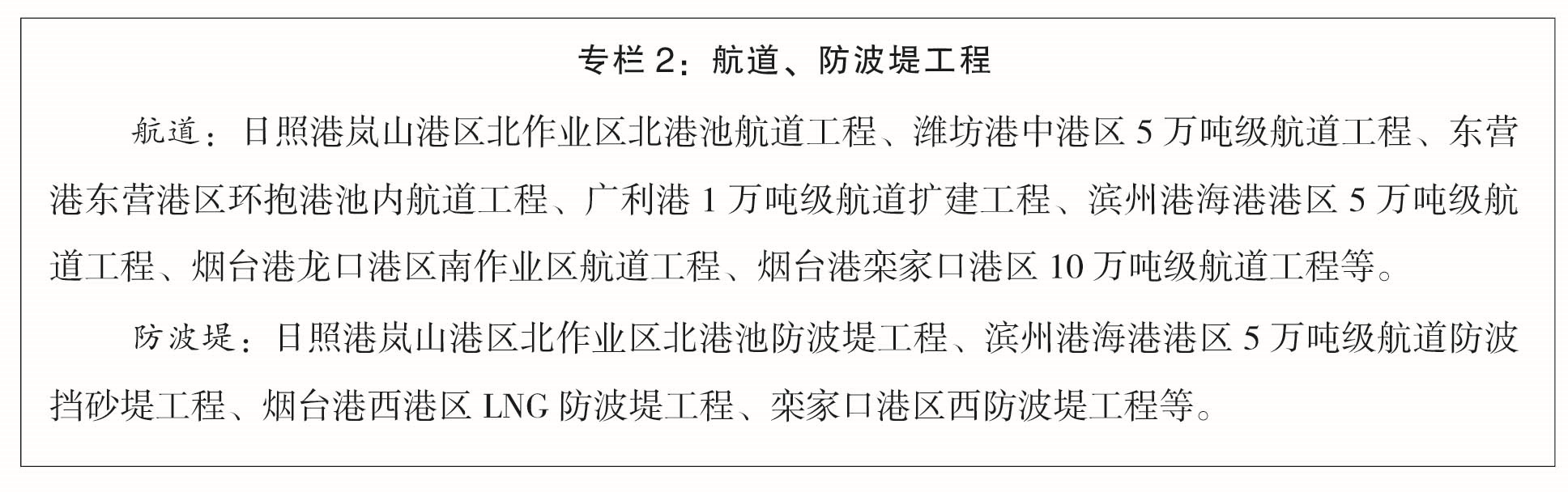 2. 提高通航保障能力。重点实施11项工程,加快建设一系列港口航道、锚地和防波堤设施,强化航道常态化疏浚维护,加快推进沿海航路和大船锚地的规划选划工作,进一步提升山东港口群靠泊掩护、锚地避风和通航保障水平。(责任单位:省交通运输厅、山东海事局、省发展改革委、省自然资源厅,沿海各市政府,省港口集团)