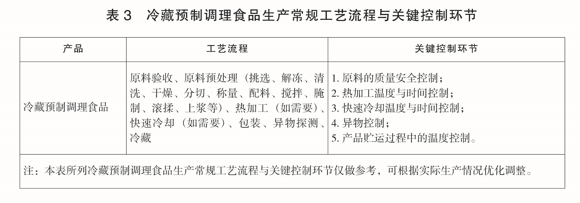 第二十一条 生产设备的配备应与产品生产工艺相符,应根据原料状况、产品特性、生产工艺等因素确定关键控制环节。冷藏预制调理食品生产常规工艺流程与关键控制环节见表3。