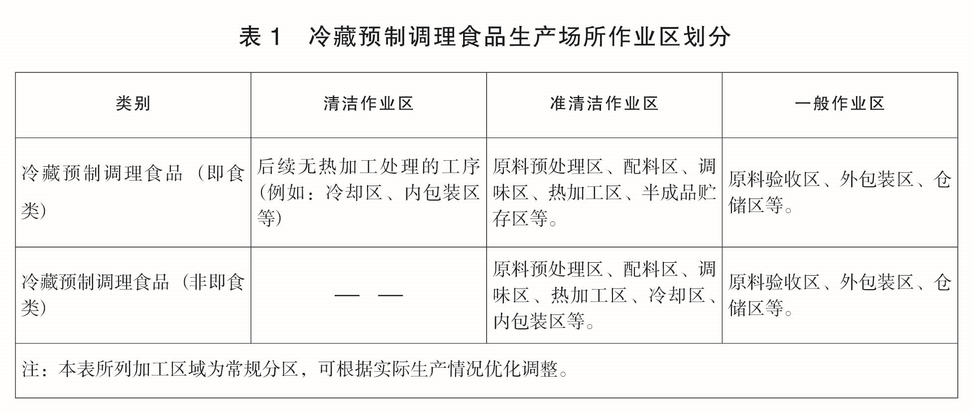 第七条 生产场所应根据生产流程、加工操作和清洁度的需要采取有效分离或分隔,避免交叉污染。生产场所可划分为清洁作业区、准清洁作业区、一般作业区,不同作业区之间应有效分隔,冷藏预制调理食品生产场所作业区划分见表1。