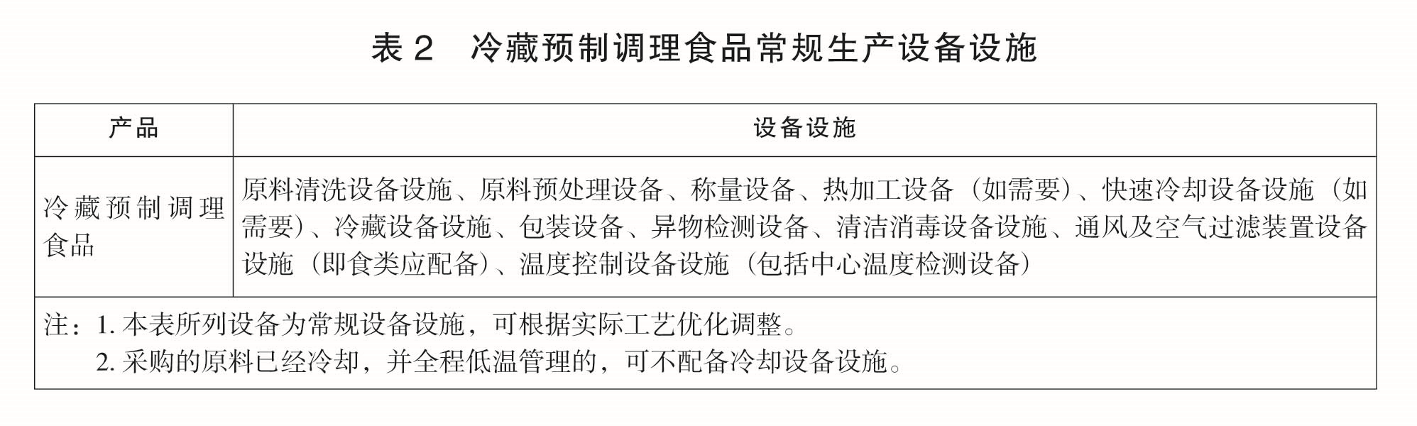 第十二条 生产设备,供排水、消毒、废弃物存放、个人卫生、通风、照明、温控、检验等设施应符合《食品生产许可审查通则》中设备设施相关规定。冷藏预制调理食品常规生产设备设施见表2。