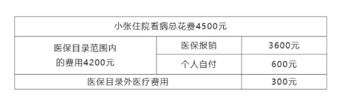 小张在医院住院看病,总花费4500元,其中纳入医保目录的医疗费用4200元,医保报销3600元,医保目录外医疗费用300元。