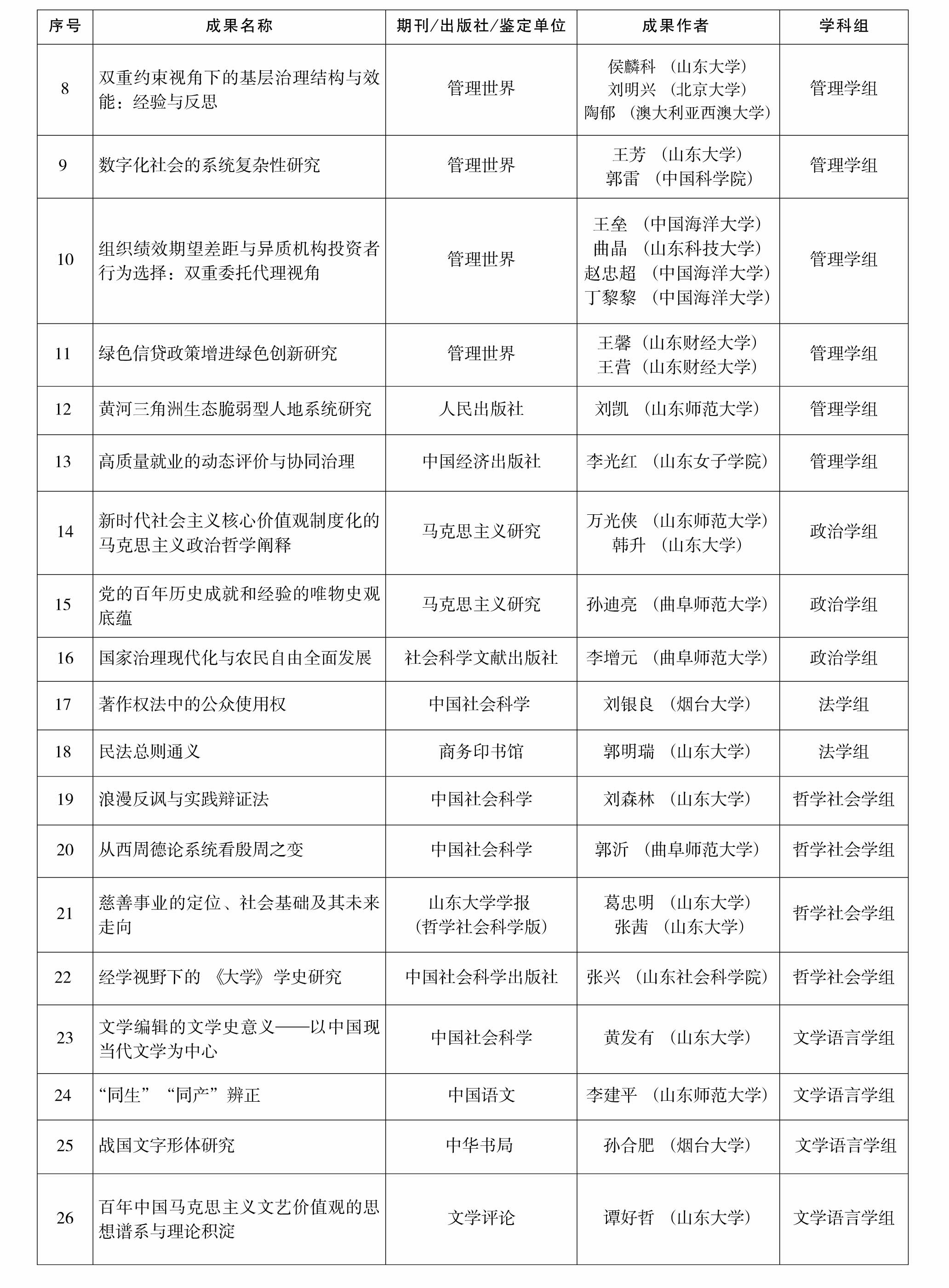 为深入贯彻落实习近平文化思想和习近平总书记关于哲学社会科学工作重要论述,进一步推动我省哲学社会科学繁荣发展,充分调动全省哲学社会科学工作者开展学术研究、社科普及、决策咨询的积极性,促进社会科学领域出精品、出力作、出人才,省政府决定,授予《开放经济体系中劳动者的工资议价能力》等3项作品第三十六届社会科学优秀成果奖特等奖并一等奖,《中国用能权交易可以获得经济红利与节能减排的双赢吗?》等47项作品一等奖,《人工智能与包容性增长——来自全球工业机器人使用的证据》等100项作品二等奖,《税收优惠能否激励风险投资:基于准自然实验的证据》等150项作品三等奖;授予山东大学教授于良春等10人社会科学突出贡献奖,授予山东大学教授代国玺等10人社会科学学科新秀奖。