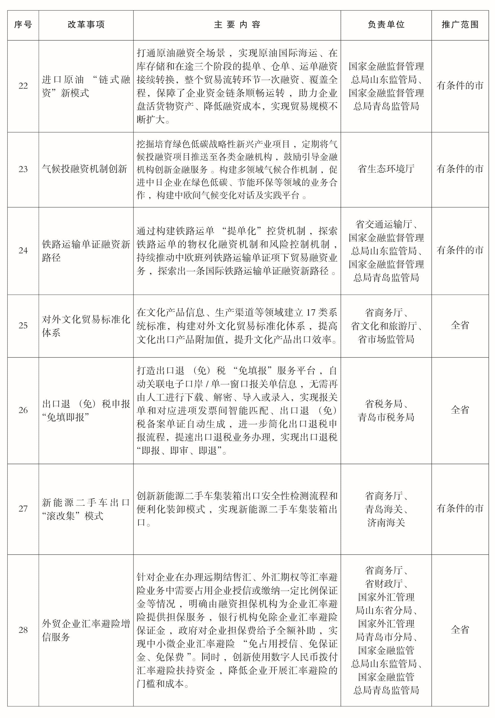 7. 金融开放创新领域(5项):“中欧班列—齐鲁号”融资新模式、以“应收国际海运费”为担保的信用保险融资新模式、进口原油“链式融资”新模式、气候投融资机制创新、铁路运输单证融资新路径。