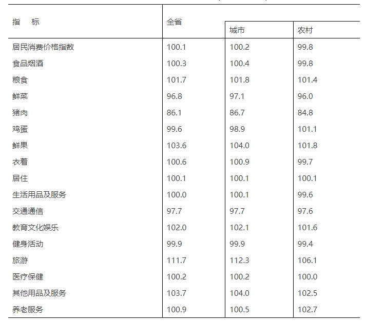 全年居民消费价格比上年上涨0.1%。其中,消费品价格下降0.3%,服务价格上涨0.9%;食品价格下降0.4%,非食品价格上涨0.2%。农产品生产者价格上涨1.0%。工业生产者出厂价格下降3.5%。工业生产者购进价格下降3.0%。