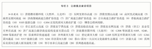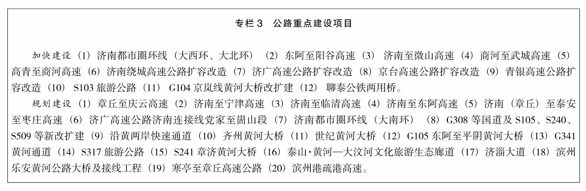 畅通都市圈公路网。完善济南都市圈“二环一联十六射”高速公路网,加快济南都市圈环线和济南绕城高速、济广高速、京台高速、青银高速繁忙路段扩能改造等项目建设。实施普通干线品质提升工程,统筹干线公路与城市道路规划建设,合理布局进出城道路网络,有序开展干线公路过境段、进出城瓶颈路段升级改造。持续推进“四好农村路”提质增效,实现户户硬化路;统筹农村公路与农村生活供水、污水管网建设,适宜路段以旅游公路标准实施提升,促进交通与旅游融合发展。打造便捷通畅的跨黄通道,加快建设G104京岚线黄河大桥改扩建、齐鲁黄河大桥等跨黄桥隧。着力提高公路服役能力和服务品质,统筹新改建和大中修项目库动态管理,提升公路预防性养护实施力度。健全完善道路交通管理设施和安全设施,提高道路交通安全水平。