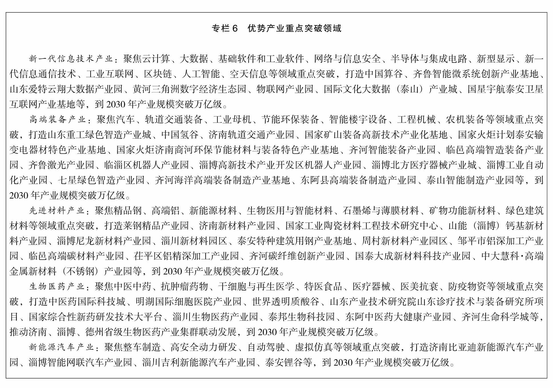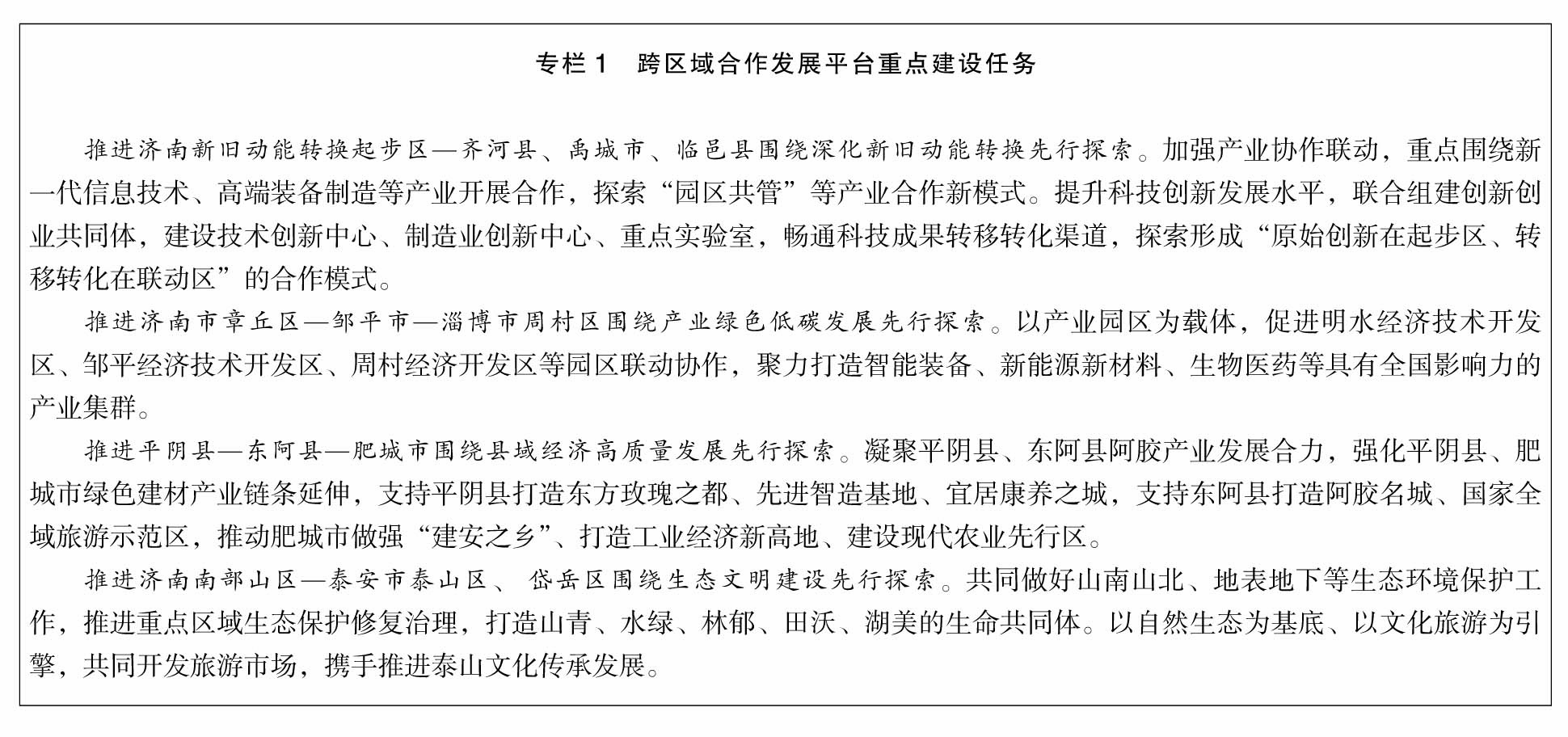 共建陆海联动的开放新格局。强化与青岛都市圈协同发展,打造济青科创制造廊带,促进黄河流域城市开放协作和陆海港口联动,唱响新时代济青“双城记”。深化济南市与临沂市革命老区对口合作,重点打造产业、基础设施、乡村振兴、文化旅游4个合作升级版,通过全方位、多层次、宽领域合作,推进两地对口合作取得实效。支持济南新旧动能转换起步区、自由贸易试验区与省级新区探索园区合作机制,发展“飞地经济”,支持聊城市茌平区建设济聊一体化的双向门户,支持淄博市临淄区建设链接济南、青岛都市圈的关键节点。