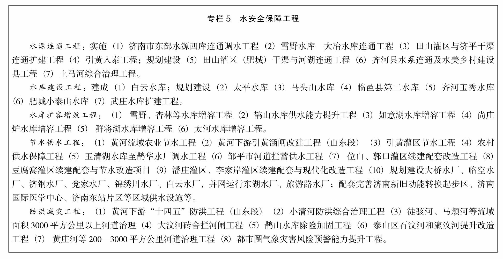 严格落实“四水四定”,强化水资源刚性约束。依托黄河、南水北调东线输水干线,统筹黄河水、长江水、淮河水、地表水、地下水和再生水等各类水源,衔接相关流域规划,完善跨流域、跨县区、多水源联合调度的水资源保障体系。加强非常规水源开发利用,完善再生水利用设施和再生水主干管网建设,加强城镇再生水利用,鼓励农村地区就地消纳利用再生水资源。强化水资源刚性约束,加强农业节水增效、工业节水减排、城镇节水降损,推行合同节水管理。加强骨干河道治理,积极开展水利工程病险隐患排查和安全鉴定。推进水利工程标准化管理,实施防洪水利提升工程。搭建综合数字化共享平台,健全防洪减灾风险指挥体系,加强跨部门合作,建立跨区域信息共享机制,发挥整体防洪效能。提升城市内涝治理能力,提升都市圈气象灾害风险预警能力,扎实推进“海绵城市”建设。统筹推进数字孪生流域、数字孪生水网、数字孪生水利工程建设,加快构建具有“四预”(预报、预警、预演、预案)功能的数字孪生水利体系。