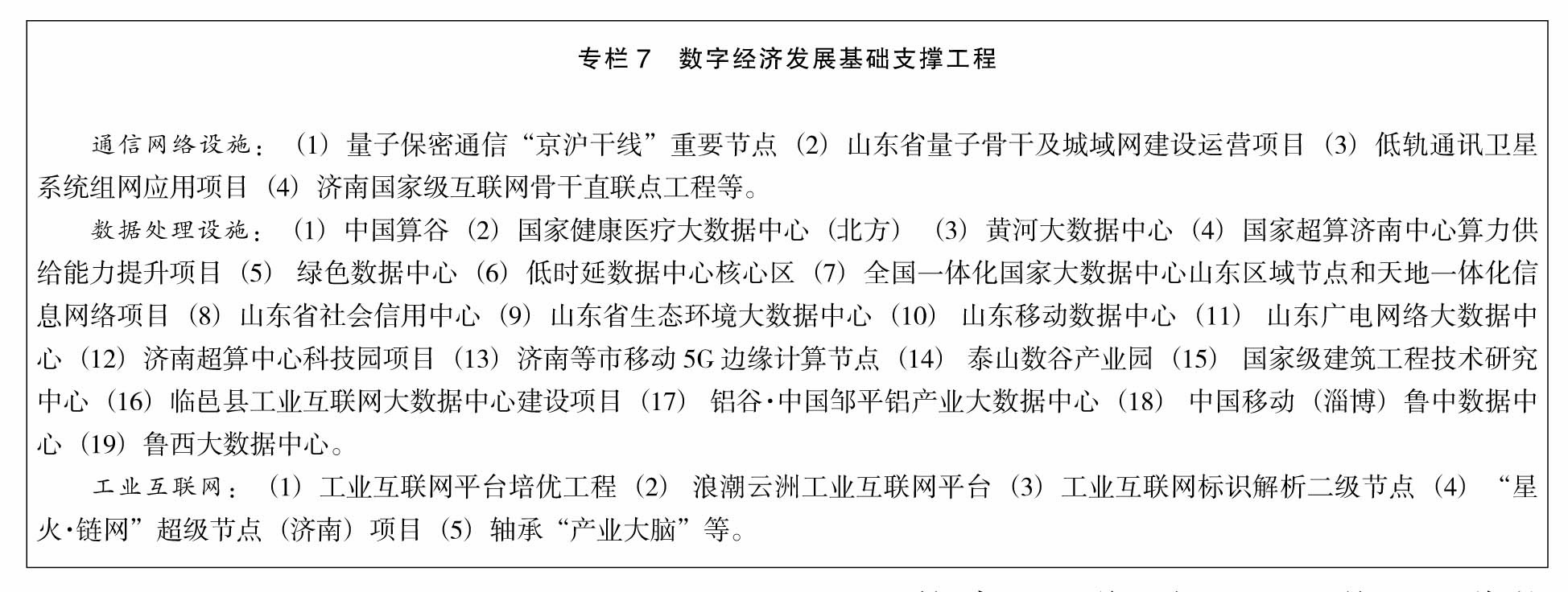 夯实数字经济发展基础。加快推进5G网络建设,扩大5G建站规模。推进“千兆城市”“百兆乡村”建设,行政村5G网络通达率达到99%以上。实施新型数据中心建设行动,支持济南市打造低时延数据中心核心区,推动淄博市临淄区、肥城市、禹城市、齐河县、邹平市、聊城市茌平区、东阿县等建成一批面向垂直应用领域的数据中心,争取布局建设2—3个工业大数据省级区域中心和行业中心。加快算力基础设施建设,布局新一代高性能计算设施和大数据处理平台,推动济南国家E级超算中心融入国家分布式超算互联网系统,建设边缘计算节点资源池,构建“边缘计算+智算+超算”多元协同、数智融合的算力体系。加快布局工业互联网解析节点,构建物联、数联、智联三位一体的新型城域物联专网,推进智能传感、数字孪生、云计算、车联网等新一代信息技术与传统基础设施融合发展、集成创新。打造无线宽带都市圈,实现热点区域和重点交通线路高速无线局域网覆盖。加快低轨通讯卫星系统组网应用,加强与地面通信骨干网融合,探索应用新场景。
