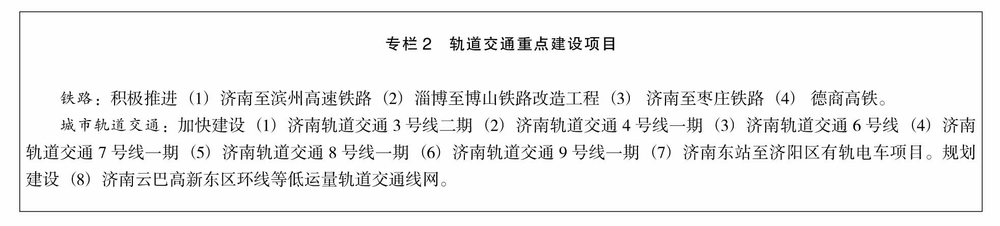共建轨道上的都市圈。以济南枢纽为核心,完善都市圈轨道交通网络布局,统筹干线铁路、城际铁路、市域(郊)铁路规划建设,并做好与城市轨道交通衔接,构建一体化、多层次的都市圈内联外通轨道交通运输体系。在都市圈主要通勤方向上构建“环米字型”轨道交通主骨架,积极推进济滨高铁、济枣高铁、德商高铁,有序推动市域(郊)铁路发展,研究推动向有条件的县域延伸。加快济南城市轨道交通二期规划项目建设和三期规划项目前期工作,规划建设济南云巴高新东区环线。
