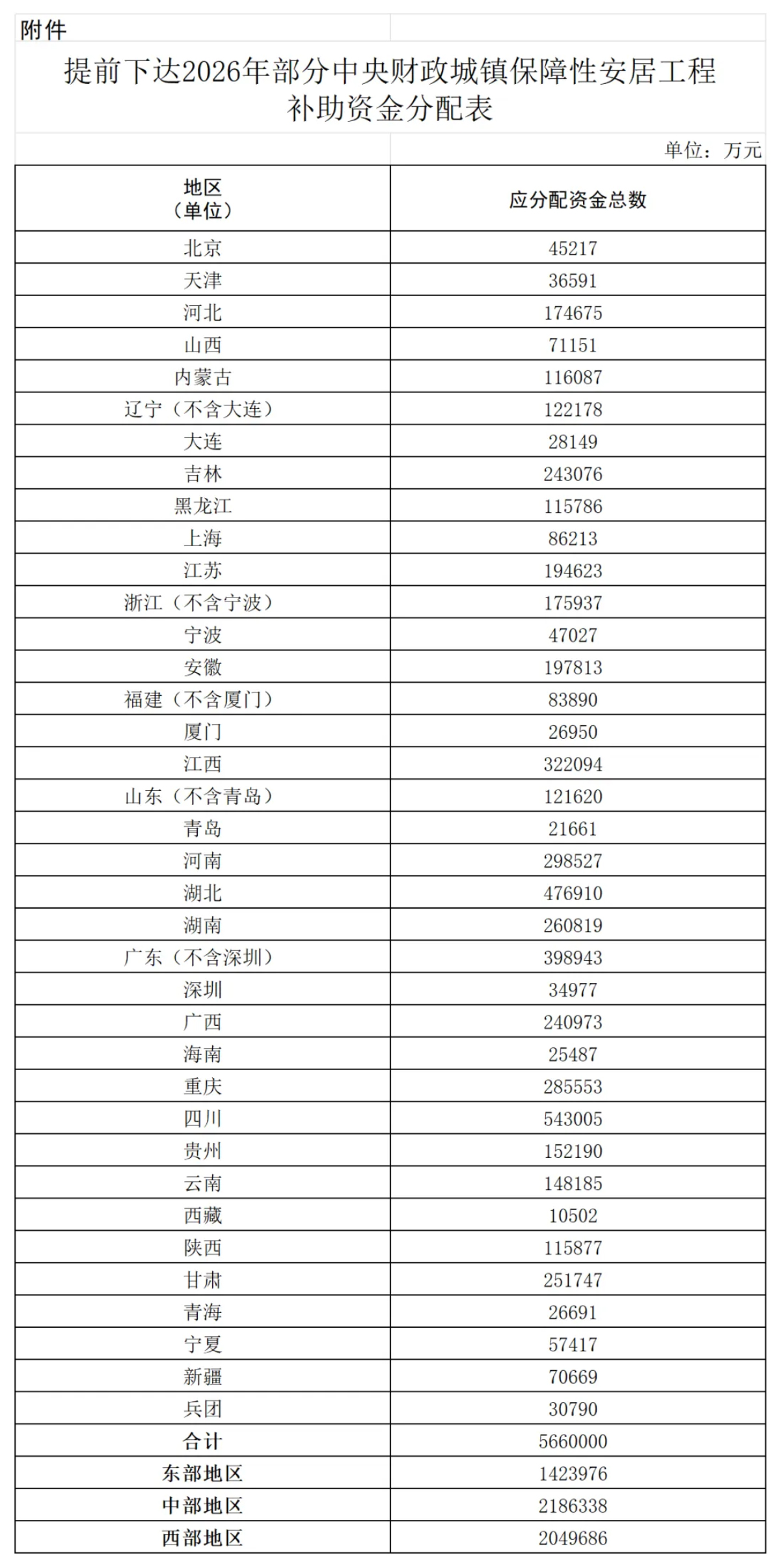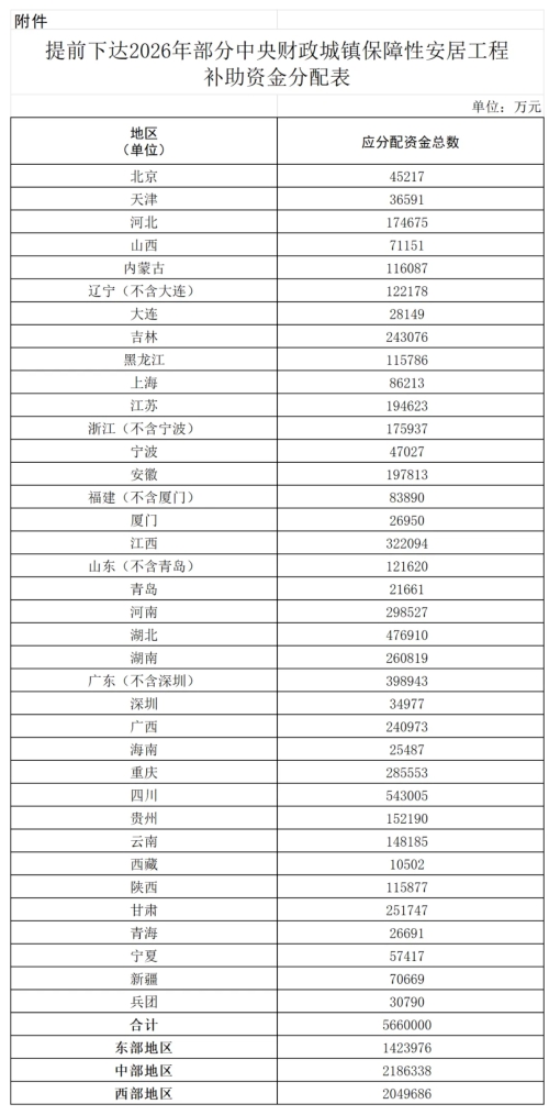 附件:提前下达2026年部分中央财政城镇保障性安居工程补助资金分配表