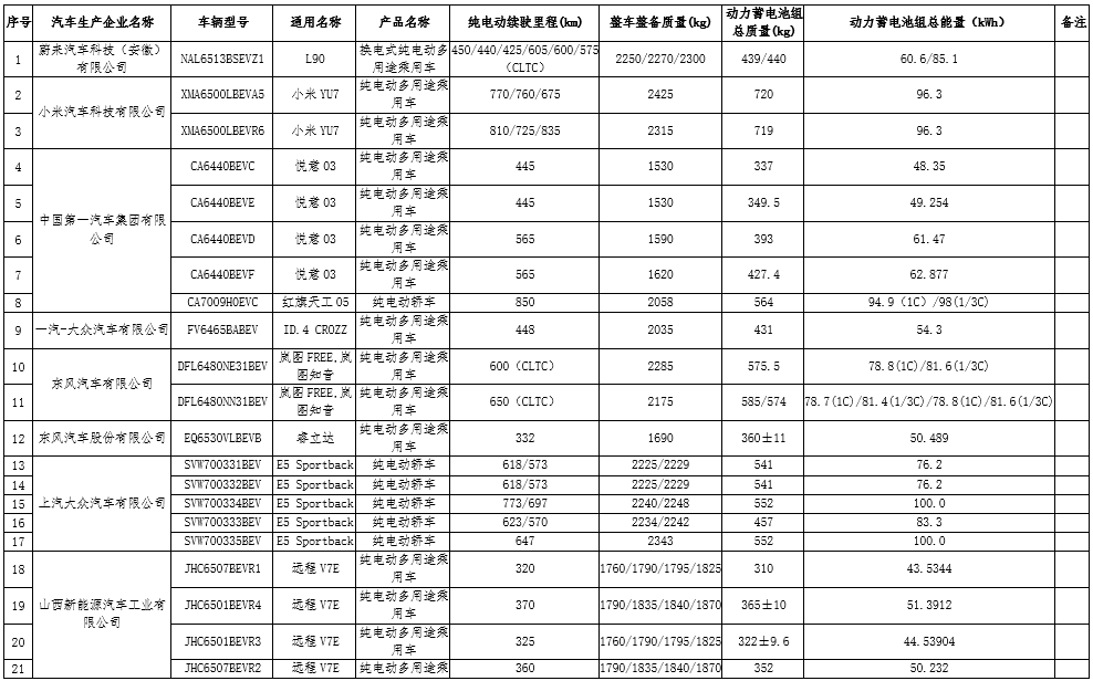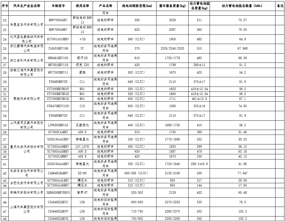 减免车辆购置税的新能源汽车车型目录(第十八批)纯电动汽车-乘用车车型如下: