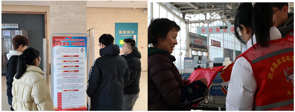 针对春运期间客流物流高峰,沂水县打私办联合交通运输局等部门,在高速路口、客运站等交通枢纽开展联合执法与宣传。检查重点运输车辆20余辆,同步向从业人员、旅客发放宣传材料1000余份,讲解冻品合法调运法规及走私识别技巧。行动累计覆盖2500余人次,接受咨询60余条,有效强化了春运关键节点的反走私管控。