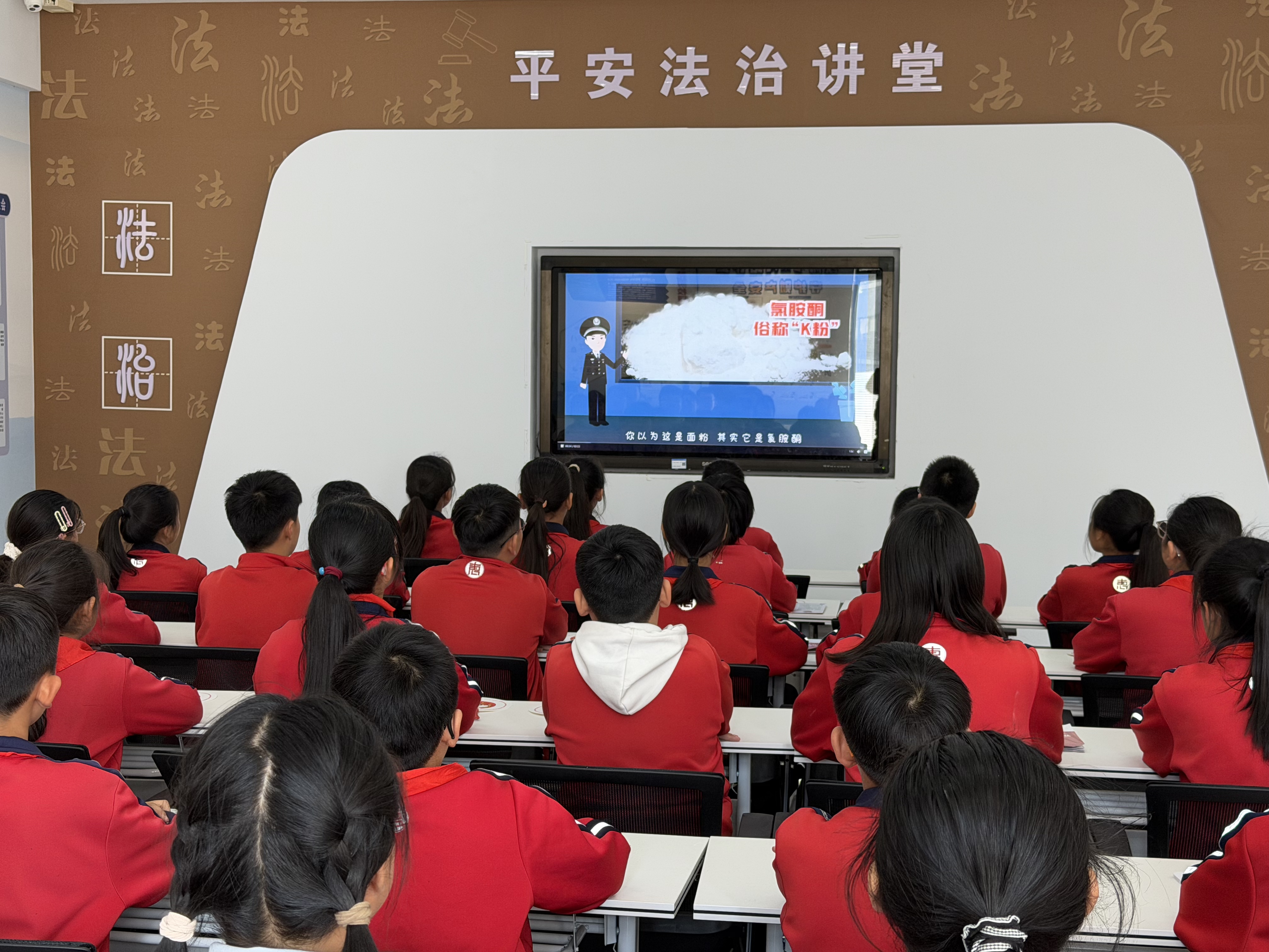 以案说法:一次法治教育,强化防范意识。带着班会的思考,同学们走进了平安法治课堂。大屏幕上,打击濒危物种走私的宣传片,让同学们直观感受到濒危动物走私活动对生态安全构成巨大威胁。随后,现场志愿者介绍了“跳跳糖”“奶茶粉”“邮票”等新型毒品,通过讲解其隐蔽的外观特征与严重的危害,帮助大家强化法治观念,提升对毒品的辨识能力和自我防范意识。